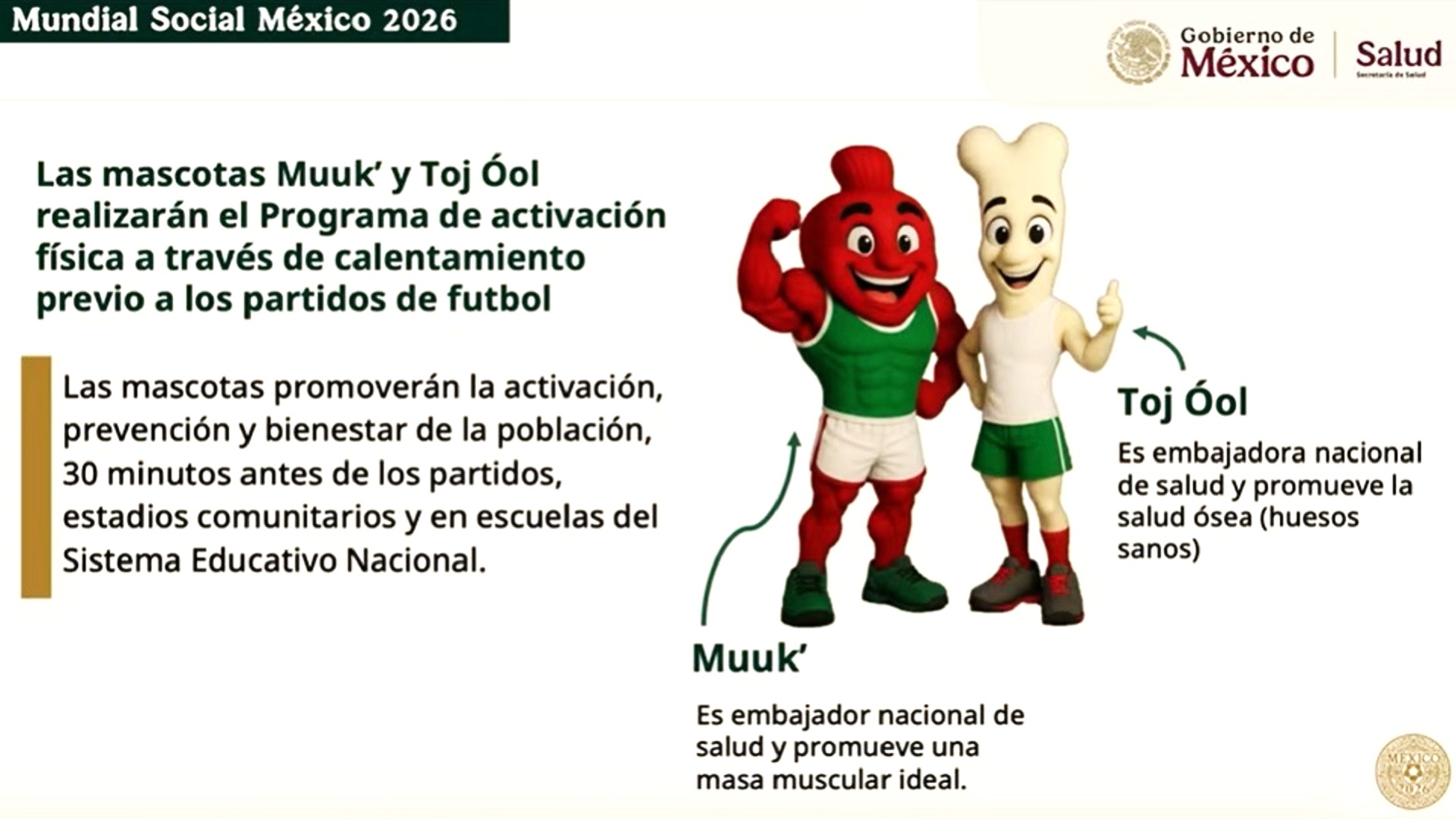 Muuk’, proviene del maya “fuerza y energía”, es embajador nacional de salud y promueva una masa muscular ideal; Toj Óol, cuyo significado es salud, es el embajador nacional de salud y promueve la salud ósea.